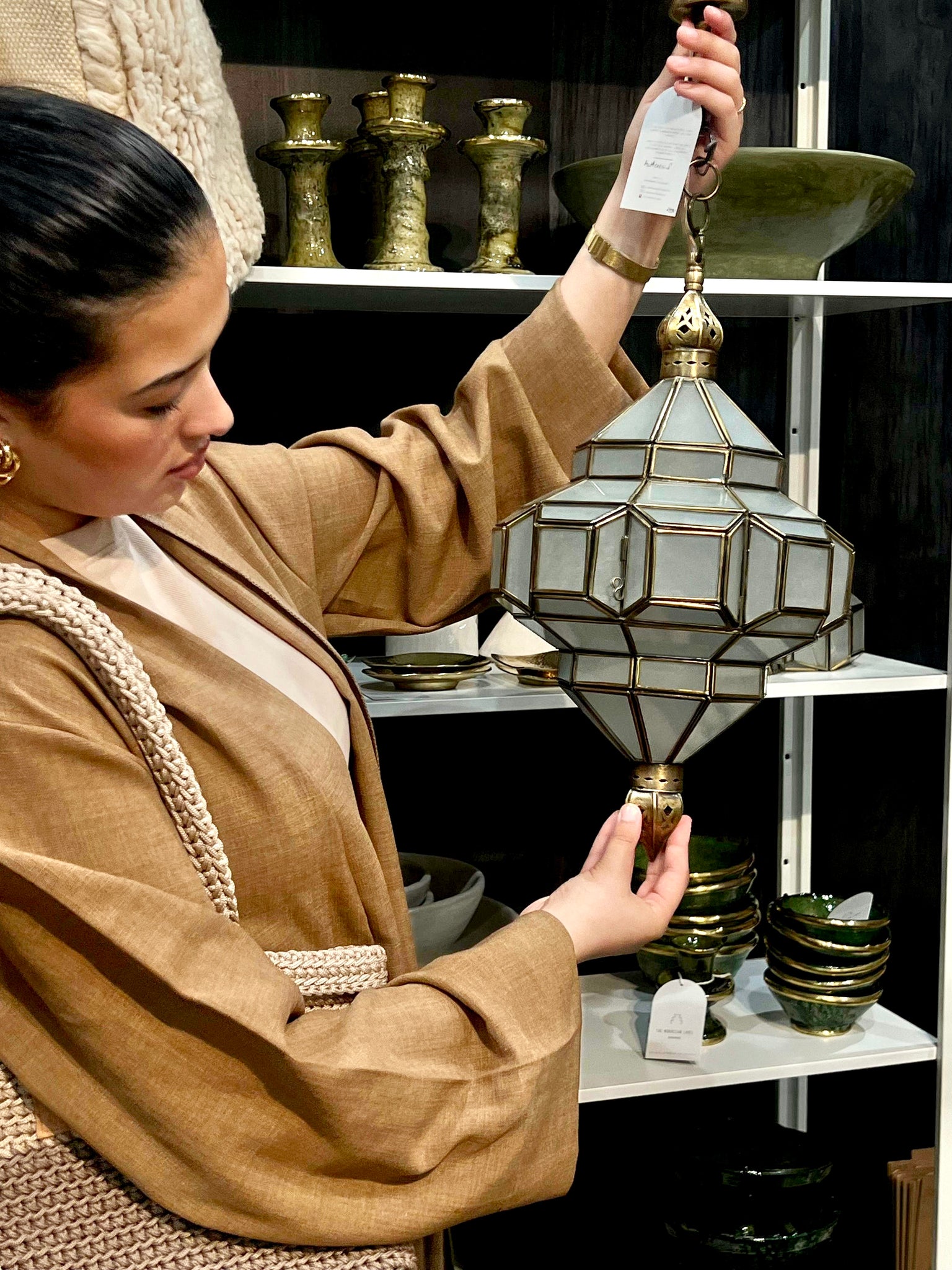Handcut pieces of glass are beautifully and artistically joined together with brass linings creating traditional geometries in different sizes and shapes. The results: A fully handmade piece of art that modern lights cannot possibly offer.