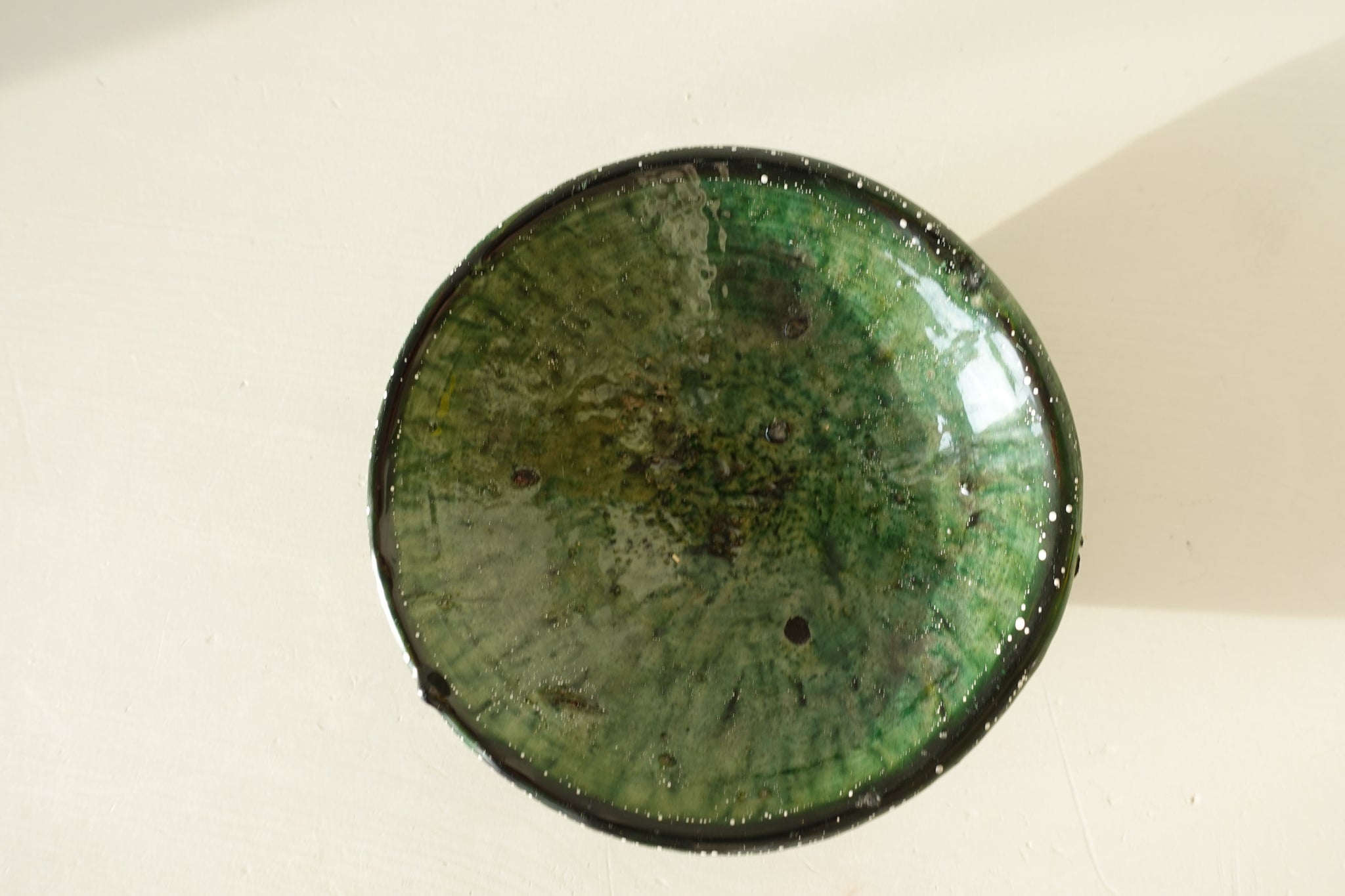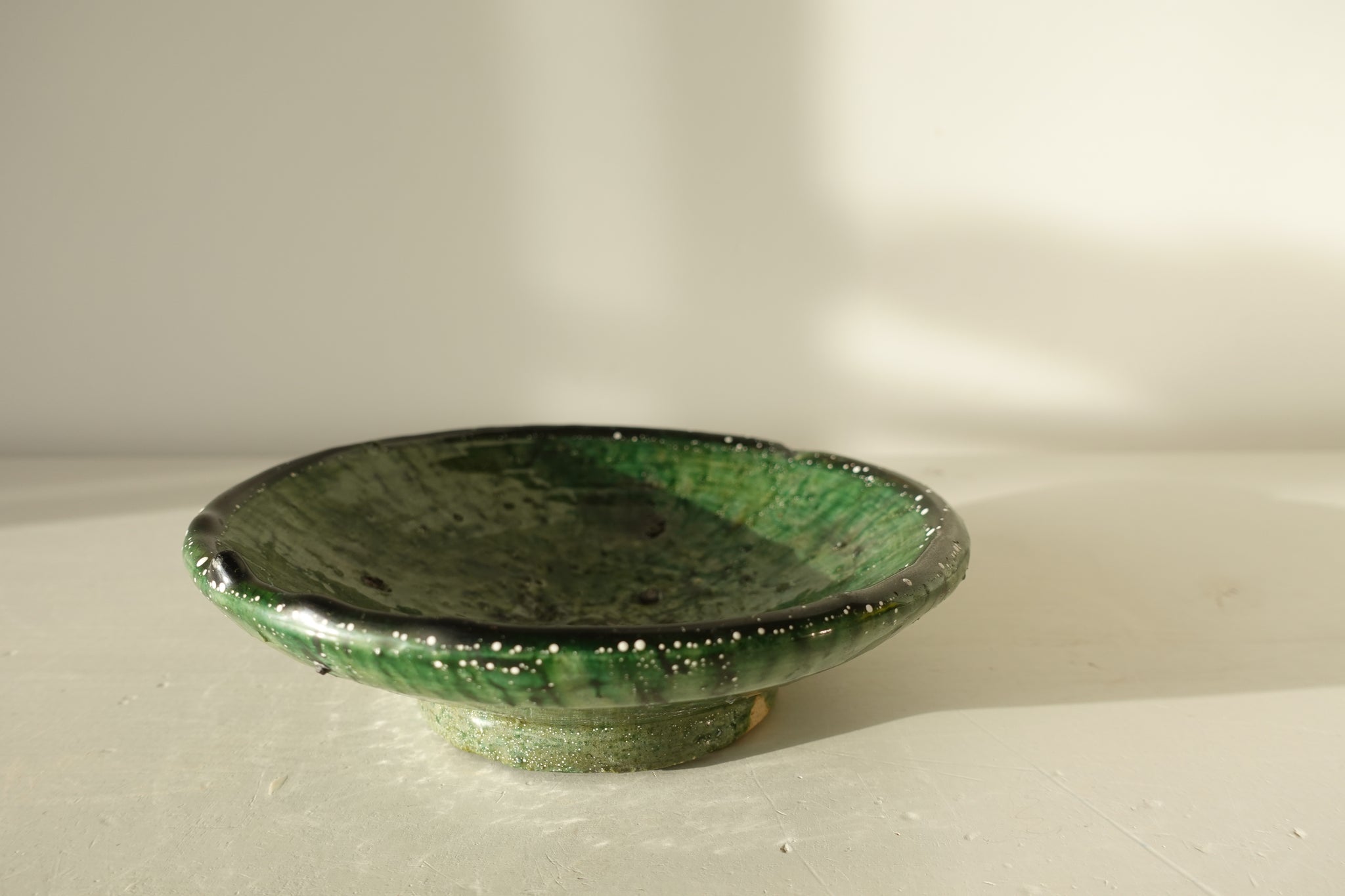 This wholeheartedly handcrafted pottery made from Draa-river clay is using the time-honoured tradition of the local ancestors. With a unique crafting process, tamegroute is only made by seven atelier-families in a small village called tamegroute and passed by from generation to generation. Its unique green shades are formed using an ancient mixture of natural minerals and elements which remains unchanged. Each piece is one of a kind and bares its own marks and textures which are created once baked in the earth kilns. Characteristic to tamegroute are the well known three marks which appear on each piece due to stacking the pottery in the kilns.