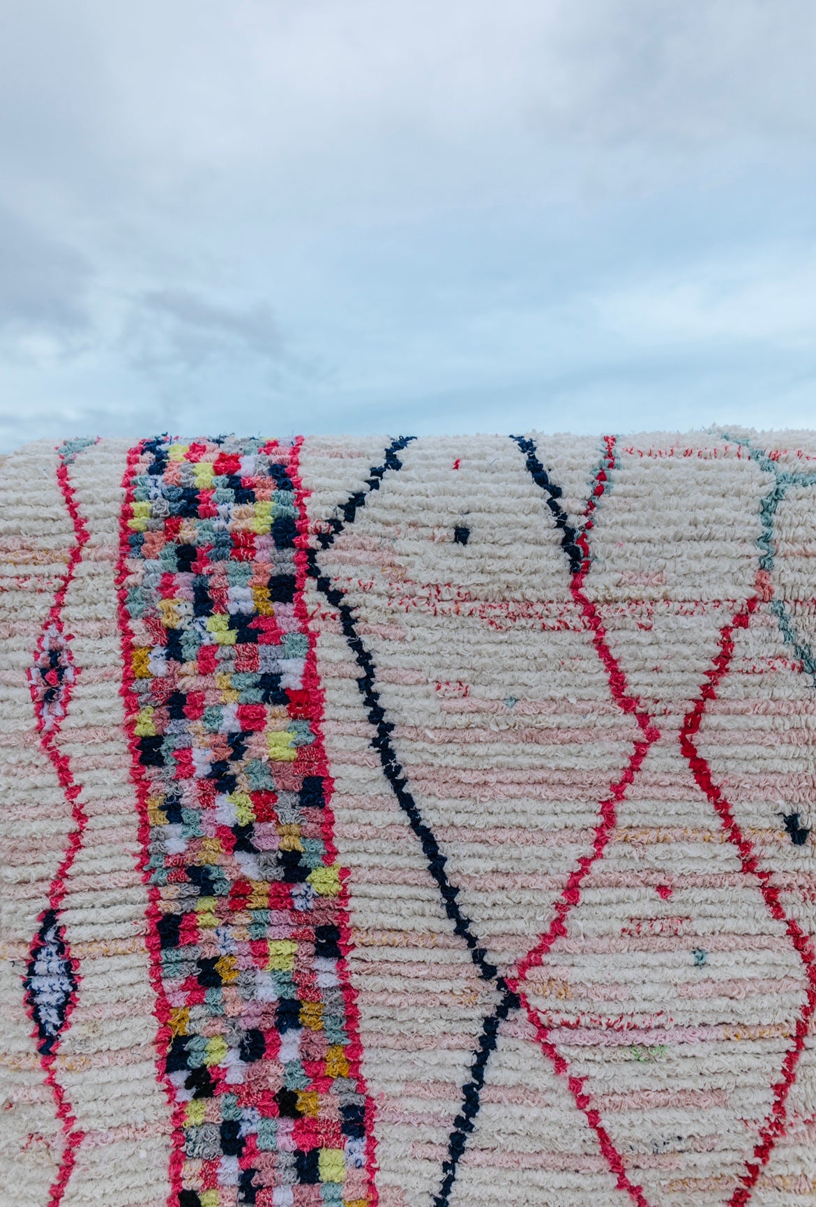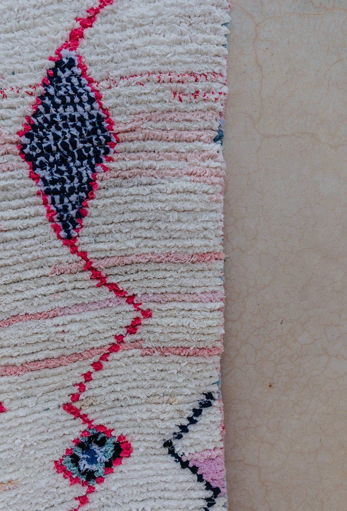 If you like to enhance the beauty of your home with a pop of color and you love planet earth, the handmade Boucherouite rugs from Morocco are the perfect choice! Till this day, Berber tribes follow age-old traditions as well as beliefs in creating Moroccan rugs. One of those rugs are the abstract and extravagant looking Boucherouite which are famous for their freestyle stitching and weaving with bright colors and, usually, assymetrical patterns. This sustainable yarn rug is also well-known for its recycled materials used as Boucherouite rugs are made of leftover materials; merely thousands of pieces of used clothing and carpets.