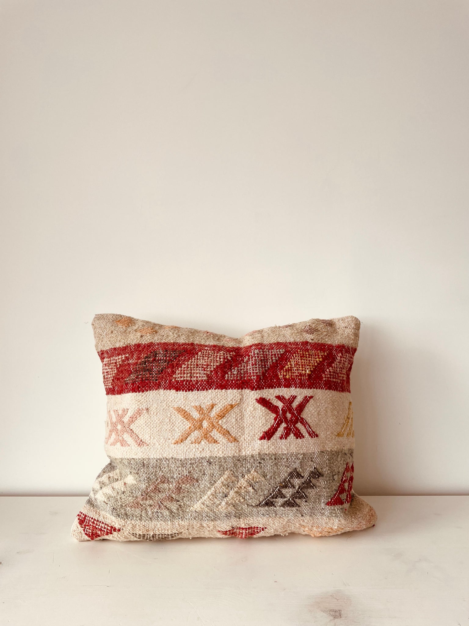 This wool pillow will lift up any interior with its colors. As in Morocco waste is unethical, this pillow is made of a vintage Moroccan kilim rug. Some minor irregularities and sign of use or age may be visible.